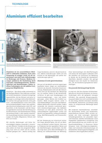 FR%u00c4SEN BOHREN DREHEN STECHEN INDUSTRIENTECHNOLOGIEAluminium effizient bearbeitenAluminium ist ein unverzichtbarer Werkstoff in zahlreichen Industrien. Doch seine Zerspanung ist weniger trivial als oft angenommen und stellt hohe Anforderungen an Werkzeuge und Prozesse. Moderne L%u00f6sungen optimieren die Bearbeitung durch innovative Schneidengeometrien, Hartmetallsorten und Beschichtungen. Zudem er%u00f6ffnen Technologien wie die additive Fertigung neue M%u00f6glichkeiten. Aluminium %u2013 das silbrig-wei%u00dfe Leichtmetall ist das h%u00e4ufigste Metall in der Erdkruste und l%u00e4sst sich einfach bearbeiten. Es besitzt einzigartige Eigenschaften, die das Element und seine Legierungen zu wichtigen technischen Werkstoffen machen: Sein geringes Gewicht, seine gute Form- und Bearbeitbarkeit sowie seine hohe Korrosionsbest%u00e4ndigkeit haben dazu gef%u00fchrt, dass Aluminium beispielsweise in der Luft- und Raumfahrt, in der Automobil- und der Verpackungsindustrie sowie bei der Herstellung von Kunstharzformen und Haushaltswaren h%u00e4ufig Verwendung findet. In den meisten industriellen Anwendungen kommen Aluminium-Legierungen mit Kupfer, Magnesium, Silizium und Zink zum Einsatz.Mit scharfen Werkzeugen und hoher Geschwindigkeit arbeiten Anwender in Aluminium sehr effizient. Trotzdem ist die Zerspanung alles andere als trivial: Das eingesetzte Werkzeug muss nicht nur scharf und f%u00fcr schnelle Prozesse geeignet sein %u2013 ebenso wichtig sind lange Standzeiten und eine robuste Konstruktion. Welche Anforderungen stellen sich also konkret an die Werkzeuge und welche Herausforderungen gibt es? Aluminium ist nicht gleich AluminiumWie gut sich das Metall und seine Legierungen bearbeiten lassen, h%u00e4ngt von verschiedenen Faktoren ab, etwa der chemischen Zusammensetzung. Beispielsweise wirkt sich der Siliziumanteil stark auf die Standzeit der Werkzeuge aus. Ein weiterer Faktor ist das Herstellungsverfahren: Es gibt zwei Hauptgruppen von Aluminiumlegierungen %u2013 Guss- und Knetlegierungen, wobei letztere den Gro%u00dfteil ausmachen. Beide Gruppen k%u00f6nnen weiter in w%u00e4rmebehandelbare und nicht w%u00e4rmebehandelbare Werkstoffe unterteilt werden. Zudem verwendet die Industrie zunehmend gesinterte Aluminiumlegierungen. Das bedeutet: Aluminium ist nicht gleich Aluminium. Die unterschiedlichen Eigenschaften wirken sich deutlich auf Spanabfuhr, Aufbauschneidenbildung, Oberfl%u00e4chenqualit%u00e4t und Prozesssicherheit aus.Bei der Zerspanung von Aluminium entstehen lange, gewellte Sp%u00e4ne, die sich um Werkzeug und Bauteil wickeln k%u00f6nnen. Dies kann zu Problemen bei der Spanabfuhr f%u00fchren und die Oberfl%u00e4cheng%u00fcte verschlechtern. Das Metall neigt dank seiner W%u00e4rmeleitf%u00e4higkeit zur Bildung von Aufbauschneiden am Werkzeug.Diese beeintr%u00e4chtigen die Oberfl%u00e4cheng%u00fcte und senken die Genauigkeit. Au%u00dferdem f%u00fchrt das Anhaften von Aluminium am Werkzeug zu Abrieb, der die Qualit%u00e4t der bearbeiteten Oberfl%u00e4che ebenfalls mindert. Die geringe Steifigkeit kann eine Quelle f%u00fcr Vibrationen sein, die die Bearbeitungsergebnisse beeintr%u00e4chtigen.Das passende Werkzeug bringt VorteileEs zeigt sich, dass die scheinbar einfache Bearbeitung von Aluminium Zerspaner vor Herausforderungen stellt, die geeignete L%u00f6sungen erfordern. Das passende Zerspanungswerkzeug spielt dabei eine nicht unerhebliche Rolle f%u00fcr den Erfolg. Deshalb entwickeln Hersteller Schneidstoffe, Geometrien und Designs stetig weiter, um entsprechende Werkzeuge bieten zu k%u00f6nnen.Mit modernen Hartmetallsorten, einschlie%u00dflich beschichteter Sorten und extrahartem, polykristallinem Diamant (PKD), erzielen Anwender sehr hohe Leistungen. Optimierte Schneidengeometrien mit passendem Spanund Freiwinkel, scharfen Schneidkanten sowie angepassten Spanbrechern erm%u00f6glichen eine gute Spanevakuierung und mindern die Aufbauschneidenbildung. In Aluminium fahren Zerspaner hohe Schnittgeschwindigkeiten.Dabei sind rotierende Schneidwerkzeuge mitbetr%u00e4chtlichen Rotationsgeschwindigkeiten und erheblichen Zentrifugalkr%u00e4ften belastet.Die neuen HELIALU-WSP eignen sich speziell f%u00fcr das Hochvorschubfr%u00e4sen von Aluminium und Aluminium-Lithium-Legierungen.Durch die Strukturanalyse mit der Finite-Elemente-Methode (FEM) und 3D-Druck-Technologie optimierte ISCAR Gewicht und Stabilit%u00e4t eines speziellen Spindelwerkzeugs mit PKD-WSP.58