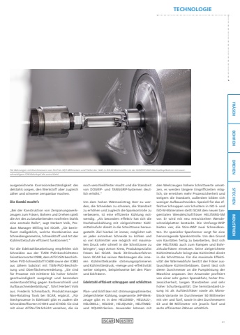 FR%u00c4SEN BOHREN DREHEN STECHEN INDUSTRIENTECHNOLOGIEausgezeichnete Korrosionsbest%u00e4ndigkeit des delstahls sorgen, den Werkstoff aber zugleich z%u00e4her und schwerer zerspanbar machen.Die Kombi macht%u2019s%u201eBei der Konstruktion von Zerspanungswerkzeugen zum Fr%u00e4sen, Bohren und Drehen spielt die Art des zu bearbeitenden rostfreien Stahls eine zentrale Rolle%u201c, sagt Herbert Volk, Product Manager Milling bei ISCAR. %u201eSie beeinflusst ma%u00dfgeblich, welche Kombination aus Schneidengeometrie, Schneidstoff und Art der K%u00fchlmittelzufuhr effizient funktioniert.%u201c F%u00fcr die Edelstahlbearbeitung empfehlen sich Schneiden aus der TiAlN PVD-beschichteten Feinstkornsorte IC908, dem AlTiCrSiN beschichteten PVD-Schneidstoff IC608 sowie der IC882 aus z%u00e4hem Substrat mit TiSiN-PVD-Beschichtung und Oberfl%u00e4chenveredelung. %u201eSie sind f%u00fcr Prozesse mit mittlerer bis hoher Schnittgeschwindigkeit ausgelegt und besonders widerstandsf%u00e4hig gegen Kerbverschlei%u00df und Aufbauschneidenbildung%u201c, f%u00fchrt Herbert Volk aus. Frederik Schmalbach, Produktmanager Non-Rotating Tools bei ISCAR, erg%u00e4nzt. %u201eF%u00fcr Stechprozesse in Edelstahl gibt es zudem die Schneidstoffsorten IC1010 und IC1030. Sie sind mit einer AlTiN+TiN-Schicht versehen, die sie den Werkzeugen h%u00f6here Schnittwerte umsetzen, es werden l%u00e4ngere Eingriffszeiten m%u00f6glich, sie erreichen mehr Prozesssicherheit und steigern die Standzeit, au%u00dferdem bilden sich weniger Aufbauschneiden. Speziell f%u00fcr das effektive Schruppen von Schultern in ISO-S- und ISO-M-Materialien stellt ISCAR den neuen tangentialen Wendelschaftfr%u00e4ser HELITANG-SM vor. Er wird mit neu entwickelten Wendeschneidplatten best%u00fcckt. Die Umfangs-WSP bieten vier, die Stirn-WSP zwei Schneidkanten. Ihr spezieller Spanformer sorgt f%u00fcr eine hervorragende Spankontrolle. Um den Grund von Kavit%u00e4ten fertig zu bearbeiten, l%u00e4sst sich der HELITANG auch zum Rampen und Bohrzirkularfr%u00e4sen einsetzen. Seine zielgerichtete K%u00fchlmittelzufuhr bringt das K%u00fchlmittel direkt in die Schnittzone. F%u00fcr die maximale Effektivit%u00e4t der W%u00e4rmeabfuhr besitzt der Fr%u00e4ser austauschbare K%u00fchlmitteld%u00fcsen. Damit l%u00e4sst sich deren Durchmesser an die Pumpleistung der Maschine anpassen. Der Anwender profitiert von einer sehr guten Spanabfuhr, hoher Prozesssicherheit, langen Standzeiten und sehr hoher Schulterqualit%u00e4t. Die Semistandard-L%u00f6sung ist als Aufsteckfr%u00e4ser sowie als Monoblock-Variante im Durchmesser 50 Millimeter mit vier und f%u00fcnf, sowie in den Durchmessern 63 und 80 Millimeter mit jeweils f%u00fcnf und sechs effizienten Z%u00e4hnen erh%u00e4ltlich.noch verschlei%u00dffester macht und die Standzeit von DOGRIP- und TANGGRIP-Systemen deutlich erh%u00f6ht.%u201cUm dem hohen W%u00e4rmeeintrag Herr zu werden, die Schneiden zu schonen, die Standzeit zu erh%u00f6hen und zugleich die Spankontrolle zu verbessern, ist eine effiziente K%u00fchlung notwendig. %u201eAls besonders effektiv hat sich die Hochdruckk%u00fchlung mit zielgerichteter K%u00fchlmittelzufuhr direkt in die Schnittzone herausgestellt. Ziel hierbei ist immer, m%u00f6glichst nah an jeder einzelnen Schneide zu k%u00fchlen und so viel K%u00fchlmittel wie m%u00f6glich mit maximalem Druck sehr schnell in die Schnittzone zu bringen%u201c, sagt Anton Kress, Produktspezialist Fr%u00e4sen bei ISCAR. Dank 3D-Druckverfahren kann ISCAR bei seinen Werkzeugen die inneren K%u00fchlmittelkan%u00e4le str%u00f6mungsoptimieren und K%u00fchlmitteldruck, -menge und -effektivit%u00e4t weiter steigern, beispielsweise bei den Planund Eckfr%u00e4sern.Edelstahl effizient schruppen und schlichtenPlan- und Eckfr%u00e4ser mit str%u00f6mungsoptimierter, zielgerichteter K%u00fchlung, sogenannte JHP-Werkzeuge gibt es in den HELI2000-, HELIALU-, HELI3MILL-, HELIDO-, HELIQUAD-, HELITANGund XQUAD-Serien. Anwender k%u00f6nnen mit F%u00fcr Bohrungen mit Durchmessern von f%u00fcnf bis 32,9 Millimetern und Tiefen bis 12xD in ISO-M-Werkstoffen ist der SUMOCHAM-Wechselkopfbohrer mit zweischneidigem ICM-Bohrkopf die erste Wahl.61