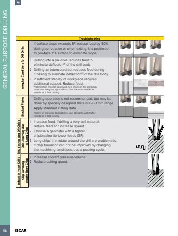 118 ISCAR GENERAL PURPOSE DRILLINGTroubleshootingIrregular Conditions for DR DrillsIf surface slope exceeds 5%u00ba, reduce feed by 50% during penetration or when exiting. It is preferred to pre-face the surface to eliminate slope.1 Drilling into a pre-hole reduces feed to eliminate deflection(1) of the drill body.2 Drilling an interrupted cut reduces feed during crossing to eliminate deflection(1) of the drill body.3 Insufficient stability of workpiece requires additional support. Reduce feed.(1) Deflection may be observed by a mark on the drill body.Note: For irregular applications, use DR drills with XOMT inserts as a first priority.Stacked PlatesDrilling operation is not recommended, but may be done by specially designed drills in 16-60 mm range. Apply standard cutting data.Note: For irregular applications, use DR drills with XOMT inserts as a first priority. Indexable Insert Drills - Troubleshooting DR Chips Chip Jamming due to Long Chips1 Increase feed. If drilling a very soft material, reduce feed and increase speed.2 Choose a geometry with a tighter chipbreaker for lower feeds (GF).3 Long chips that rotate around the drill are problematic. If chip formation can not be improved by changing the machining conditions, use a pecking cycle.Chip Jamming despite Short Chips1 Increase coolant pressure/volume.2 Reduce cutting speed.