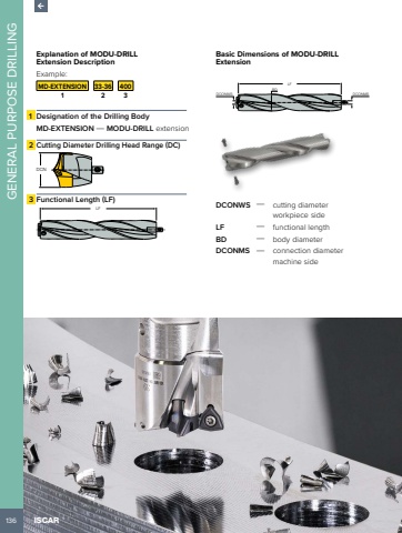136GENERAL PURPOSE DRILLINGISCARExplanation of MODU-DRILL Extension Description Example:MD-EXTENSION 33-36 4001 2 31 Designation of the Drilling BodyMD-EXTENSION %u2014 MODU-DRILL extension2 Cutting Diameter Drilling Head Range (DC)DCN3 Functional Length (LF)LFBasic Dimensions of MODU-DRILL ExtensionLFDCONMSBDDCONWSDCONWS %u2014 cutting diameter workpiece sideLF %u2014 functional lengthBD %u2014 body diameterDCONMS %u2014 connection diameter machine side