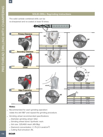 178 ISCAR PRE-THREAD DRILLING WITH CHAMFERING SOLID-DRILL Regrinding InstructionsThe solid carbide combined drills can be re-sharpened and re-coated at least 10 times. 45%u00b07%u00b0 spiral relief1 Primary Clearance%u03b1%u00b0 D Range7 0.8-6.010 >6.12 Secondary Clearance3 Chisel%u03b1%u00b0 D Range100 3.0-4.8105 4.9-1095 10.1-204 Edge PreparationRAAR D Range0.02 0.8-6.00.03 6.1-18.00.04 18.1>UPNotes:%u2022 Recommended for each grinding operation: rotate the drill 180%u00b0 and repeat the grinding procedure.%u2022 Grinding wheel recommended specifications:%u2022 Diameter grinding wheel: GA2.%u2022 Grinding wheel bond: Synthetic resin.%u2022 Grit size: 325/400 mesh (45/38%u03bc).%u2022 Diamond concentration: C-75 (3.3 carat/cm3).%u2022 Cutting fluid emulsion 3%.