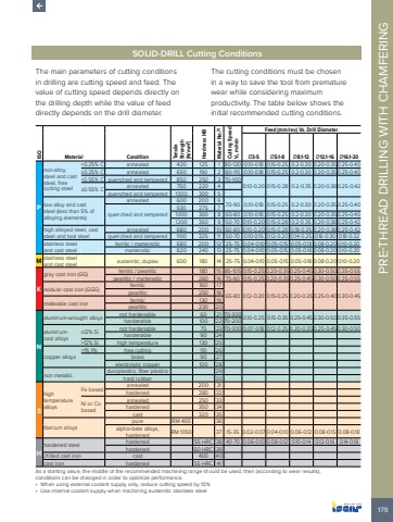 179PRE-THREAD DRILLING WITH CHAMFERING SOLID-DRILL Cutting ConditionsThe main parameters of cutting conditions in drilling are cutting speed and feed. The value of cutting speed depends directly on the drilling depth while the value of feed directly depends on the drill diameter. The cutting conditions must be chosen in a way to save the tool from premature wear while considering maximum productivity. The table below shows the initial recommended cutting conditions.ISOMaterial Condition Tensile Strength [N/mm2]Hardness HBMaterial No.(1)Cutting Speed Vc m/minFeed (mm/rev) Vs. Drill Diameter%u00d83-5 %u00d85.1-8 %u00d88.1-12 %u00d812.1-16 %u00d816.1-20Pnon-alloy steel and cast steel, free cutting steel<0.25% C annealed 420 125 1 80-120 0.10-0.18 0.15-0.25 0.2-0.30 0.20-0.350.25-0.40%u22650.25% C annealed 650 190 2 80-110 0.10-0.18 0.15-0.25 0.2-0.30 0.20-0.350.25-0.40<0.55% C quenched and tempered 850 250 3 70-1000.10-0.20 0.15-0.28 0.2-0.35 0.20-0.380.25-0.42 %u22650.55% C annealed 750 220 4quenched and tempered 1000 300 5low alloy and cast steel (less than 5% of alloying elements)annealed 600 200 6 70-90 0.10-0.18 0.15-0.25 0.2-0.30 0.20-0.350.25-0.40quenched and tempered930 275 71000 300 8 60-80 0.10-0.18 0.15-0.25 0.2-0.30 0.20-0.350.25-0.401200 350 9 50-70 0.10-0.20 0.15-0.28 0.2-0.35 0.20-0.380.25-0.42high alloyed steel, cast steel and tool steelannealed 680 200 10 60-80 0.10-0.20 0.15-0.28 0.18-0.35 0.20-0.380.25-0.42quenched and tempered 1100 325 11 50-70 0.10-0.15 0.12-0.20 0.14-0.25 0.16-0.30 0.18-0.32stainless steel and cast steelferritic / martensitic 680 200 12 25-75 0.04-0.10 0.05-0.15 0.05-0.18 0.08-0.20 0.10-0.20martensitic 820 240 13 25-75 0.04-0.10 0.05-0.15 0.05-0.18 0.08-0.20 0.10-0.20M stainless steel and cast steel austenitic, duplex 600 180 14 25-75 0.04-0.10 0.05-0.15 0.05-0.18 0.08-0.20 0.10-0.20Kgray cast iron (GG) ferritic / pearlitic 180 15 85-105 0.15-0.25 0.20-0.350.25-0.450.30-0.500.35-0.55pearlitic / martensitic 260 16 75-90 0.15-0.25 0.20-0.350.25-0.450.30-0.500.35-0.55nodular cast iron (GGG) ferritic 160 1765-80 0.12-0.20 0.15-0.25 0.20-0.350.25-0.400.30-0.45 pearlitic 250 18malleable cast iron ferritic 130 19pearlitic 230 20Naluminum-wrought alloys not hardenable 60 21 70-300 0.10-0.25 0.15-0.35 0.25-0.450.30-0.500.35-0.55 hardenable 100 22 70-200aluminumcast alloys%u226412% Si not hardenable 75 23 70-300 0.07-0.18 0.12-0.25 0.20-0.350.25-0.450.30-0.50hardenable 90 24>12% Si high temperature 130 25copper alloys>1% Pb free cutting 110 26brass 90 27electrolytic copper 100 28non metallic duroplastics, fiber plastics 29hard rubber 30Shigh temperature alloysFe based annealed 200 31hardened 280 32Ni or Co basedannealed 250 33hardened 350 34cast 320 35titanium alloyspure RM 400 36alpha+beta alloys, hardened RM 1050 37 15-35 0.02-0.07 0.04-0.10 0.06-0.12 0.08-0.15 0.08-0.18Hhardened steel hardened 55 HRC 38 40-70 0.06-0.10 0.08-0.12 0.10-0.14 0.12-0.16 0.14-0.18hardened 60 HRC 39chilled cast iron cast 400 40cast iron hardened 55 HRC 41As a starting value, the middle of the recommended machining range should be used, then (according to wear results), conditions can be changed in order to optimize performance.%u2022 When using external coolant supply only, reduce cutting speed by 10%%u2022 Use internal coolant supply when machining austenitic stainless steel