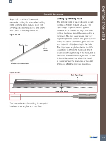 221DEEP HOLE DRILLINGGundrill StructureA gundrill consists of three main elements: cutting tip, also called drilling head (working part), tubular stem with a V-shaped external groove, and shank also called driver (Figure 6.5.2.1).Figure 6.5.2.1Tubular stemCutting tip / Drilling headShank / DriverCutting Tip / Drilling HeadThe drilling head is tapered on its length to reduce friction (Figure 6.5.2.2). The taper angle depends on the type of material to be drilled. For high precision drilling, the taper should be reduced to a minimum. The low taper angle has very high straightness control and good surface finish, but at the same time, poor tool life and high risk of tip jamming in the hole. The high taper angle has better tool life (especially in shrinking materials) and a lower risk of tip jamming in the hole, but at the same time on bad straightness control. It should be noted that when the head is resharpened, the diameter of the drill changes, affecting the hole tolerance.Figure 6.5.2.2Back Taper AngleBack Taper AngleThe key variables of a cutting tip are point location, nose angles, and pad form.
