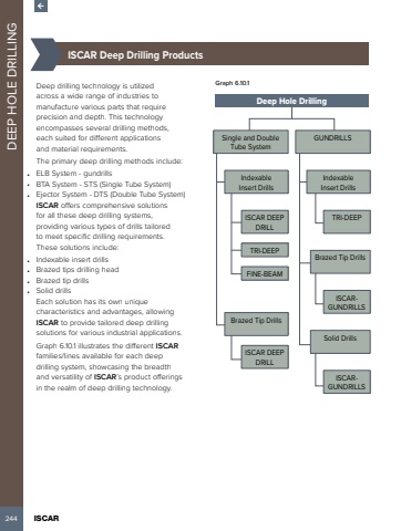 244 ISCAR DEEP HOLE DRILLING %u00bd%u0009ISCAR Deep Drilling ProductsDeep drilling technology is utilized across a wide range of industries to manufacture various parts that require precision and depth. This technology encompasses several drilling methods, each suited for different applications and material requirements.The primary deep drilling methods include:%u2022 ELB System - gundrills%u2022 BTA System - STS (Single Tube System)%u2022 Ejector System - DTS (Double Tube System)ISCAR offers comprehensive solutions for all these deep drilling systems, providing various types of drills tailored to meet specific drilling requirements. These solutions include:%u2022 Indexable insert drills%u2022 Brazed tips drilling head%u2022 Brazed tip drills%u2022 Solid drillsEach solution has its own unique characteristics and advantages, allowing ISCAR to provide tailored deep drilling solutions for various industrial applications.Graph 6.10.1 illustrates the different ISCARfamilies/lines available for each deep drilling system, showcasing the breadth and versatility of ISCAR%u2019s product offerings in the realm of deep drilling technology.Graph 6.10.1Deep Hole DrillingIndexableInsert DrillsBrazed Tip DrillsIndexableInsert DrillsTRI-DEEPTRI-DEEPSingle and DoubleTube SystemGUNDRILLSFINE-BEAMISCAR DEEP DRILLISCAR DEEP DRILLBrazed Tip DrillsSolid DrillsISCARGUNDRILLSISCARGUNDRILLS