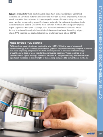 317CUTTING MATERIAL GRADES AND ENGINEERING MATERIALSISCAR%u2019s products for hole machining are made from cemented carbide. Cemented carbides are very hard materials and therefore they can cut most engineering materials, which are softer. In most cases, to improve performance of thread cutting products when applied to machining a specific class of materials, the indexable inserts and solid carbide tools are coated. One of the most common methods of coating is by physical vapor deposition (PVD). PVD coatings have a wide distribution in indexable thread turning inserts and thread solid carbide tools because they leave the cutting edges sharp. PVD coatings are applied at relatively low temperature (about 500%u00b0C).Nano layered PVD coating PVD coatings were introduced during the late 1980%u2019s. With the use of advanced nanotechnology, PVD coatings performed a gigantic step in overcoming complex problems that were impeding progress in the field. Developments in science and technology brought a new class of wear-resistant nano layered coatings. These coatings are a combination of layers having a thickness of up to 50 nm (nanometers) and demonstrate significant increases in the strength of the coating compared to conventional methods.