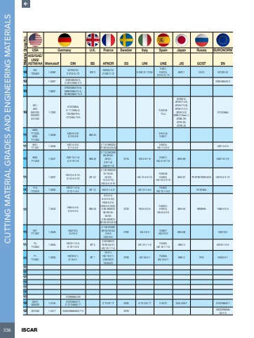 336 ISCAR CUTTING MATERIAL GRADES AND ENGINEERING MATERIALS Material Group No.USA Germany U.K. France Sweden Italy Spain Japan Russia EURONORMAISI/SAE/UNS/ASTM/AA Werkstoff DIN BS AFNOR SS UNI UNE JIS GOST EN10 D3;T30403 1.2080 X210Cr12;X 210 Cr 12 BD 3 X200Cr12;Z 200 C 12 X 205 Cr 12 KUF.521;F.5212;X 210 Cr 12SKD 1 Ch12 X210Cr1210 1.2367 X38CrMoV5-3;X 38 CrMoV 5 3 X38CrMoV5-310 1.695727NiCrMoV15-6;26NiCrMoV14-5;26 NiCrMoV 14 510501;502;S50100;S50200;K415451.7362X12CrMo5;X 11 CrMo 5;12CrMo19-5;12 CrMo 19 5F.240.B;TU.JSCMV 6;SFVA F 5 A;SFVA F 5 B;SFVA F 5 C;SFVA 5 D;SNB 5 Class 1;STBA 29;STFA 25;STPA 25X12CrMo511M33;T11333;M34;T113341.3249 HS2-9-2-8;S 2-9-2-8 BM 34 2-9-2-8;F.561111 M41;T11341 1.3246 HS7-4-2-5;S 7-4-2-5Z 110 WKCDV 07-05-04-04-02F.5615;HS 7-4-2-5 HS7-4-2-511 M42;T11342 1.3247 HS2-10-1-8;S 2-10-1-8 BM 42Z 110 DKCWV 09-08-04-02-01;2-9-1-8;HS2-9-1-82716 HS 2-9-1-8 F.5617;HS 2-10-1-8 SKH 59 HS2-10-1-811 1.3207 HS10-4-3-10;S 10-4-3-10 BT 42Z 130 WKCDV 10-10-04-04-03;10-4-3-10;HS10-4-3-10HS 10-4-3-10F.550.B;F.5553;HS 10-4-3-10SKH 57 R12F3K10M3-SCh HS10-4-3-1011 T15;T12015 1.3202 HS12-1-4-5;S 12-1-4-5 BT 15 HS12-1-4-5 HS 12-1-5-5 F.5563;HS 12-1-5-5 R13F4K511 1.3243 HS6-5-2-5;S 6-5-2-5 BM 356-5-2-5;6-5-2-5 HC;HS6-5-2-5;HS6-5-2-5HC;Z 85 WDKCV 06-05-05-04-02;Z 90 WDKCV 06-05-05-04-022723 HS 6-5-2-5F.550.C;F.5613;HS 6-5-2-5SKH 55 R6M5K5 HS6-5-2-511 M7;T11307 1.3348 HS2-9-2;S 2-9-2Z 100 DCWV 09-04-02-02;2-9-2;HS2-9-22782 HS 2 9 2 F.5607;HS 2-9-2 SKH 58 HS2-9-211 T4;T12004 1.3255 HS18-1-2-5;S 18-1-2-5 BT 4Z 80 WKCV 19-05-04-01;HS 18-1-1-5HS 18-1-1-5 F.5530;HS 18-1-1-5 SKH 3 HS18-1-2-511 T1;T12001 1.3355 HS18-0-1;S 18-0-1 BT 118-0-1;HS 18-0-1;Z 80 WCV 18-04-012750 HS 18-0-1 F.5520;HS 18-0-1 SKH 2 R18 HS18-0-111111111111111 X10NiMoCrV612 430 F;S43020 1.4104 X12CrMoS17;X 12 CrMoS 17 Z 13 CF 17 2383 X 10 CrS 17 F.3413 SUS 430 F X12CrMoS1712 S31500 1.4417 GX2CrNiMoN25-7-3 2376 GX2CrNiMoN 25-7-3