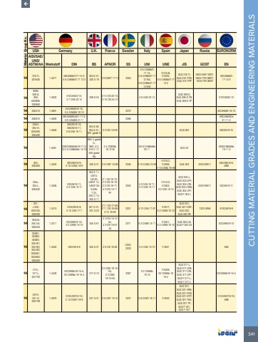 341CUTTING MATERIAL GRADES AND ENGINEERING MATERIALS Material Group No.USA Germany U.K. France Sweden Italy Spain Japan Russia EURONORMAISI/SAE/UNS/ASTM/AA Werkstoff DIN BS AFNOR SS UNI UNE JIS GOST EN14 316 Ti;S31635 1.4571 X6CrNiMoTi17-12-2;X 6 CrNiMoTi 17 12 2320 S 31;320 S 18 Z 6 CNDT 17-12 2350X 6 CrNiMoTi 17 12;X 6 CrNiMoTi 17 12 KG;X 6 CrNiMoTi 17 12 KWF.310.B;F.3535;X 6 CrNiMoTi 17 12 2SUS 316 Ti;SUS 316 TiTB;SUS 316 TiTP08Ch16N11M3T;08Ch17N13M2T;10Ch17N13M2TX6CrNiMoTi 17-12-214309S;309 S;309;S30908;S309001.4833 X12CrNi23-13;X 7 CrNi 23 14 309 S 24 Z 15 CN 23-13;Z 15 CN 24-13 X 6 CrNi 23 14SUS 309 S;SUS 309 S TB;SUS 309 S TPX12CrNi23-1314 S30415 1.4891 X4CrNiSiN18-10;X 4 CrNiSiN 18 10 2372 X4CrNiSiN 18-1014 S30815 1.4893 X9CrNiSiNCe21-11-2;X 8 CrNiSiN 21 11 2368 X9CrNiSiNCe 21-11-214304H;304 H;S30409;S304801.4948X6CrNi18-10;X6CrNi18-11;X 6 CrNi 18 11;304 S 50;304 S 51;801 grade AZ 5 CN 18-09 SUS 302 X6CrNi18-1014 1.4581 GX5CrNiMoNb19-11-2;G X 5 CrNiMoNb 18 10ANC 4 grade C;ANC 4 C;318 C 17;845 grade NbZ 4 CNDNb 18.12 MGX 6 CrNiMoNb 20 11 SCS 22 GX5CrNiMoNb 19-11-214 303;S30300 1.4305 X8CrNiS18-9;X 10 CrNiS 18 9 303 S 31 Z 8 CNF 18-09 2346 X 10 CrNiS 18 09F.310.C;F.3508;X 10 CrNiS 18-09SUS 303 30Ch18N11 X8CrNiS18-9;58M14304L;304 L;S304031.4306 X2CrNi19-11;X 2 CrNi 19 11304 S 11;LW14;LW 20;LWCF 14; LWCF 20;S.536;T.74;304 C 12;304 S 11Z 1 CN 18-12;Z 3 CN 18-10;Z 3 CN 19-11;Z 3 CN 19-11 FF2352 X 2 CrNi 18 11;X 3 CrNi 18 11F.310.G;F.3503;X 2 CrNi 18 10SUS 304 L;SUS 304 LFP;SUS 304 LTB;SUS 304 LTBS;SUS 304 LTP;SUS F 304 L03Ch18N11 X2CrNi19-1114301;J 230;S30100;S302001.4310 X10CrNi18-8;X 12 CrNi 17 7301 S 21;301 S 22Z 11 CN 17-08;Z 11 CN 18-08;Z 12 18-092331 X 12 CrNi 17 07 F.3517;X 2 CrNiN 18 10SUS 301;SUS 301-CSP;SUS 302;SUS 302 FB12Ch18N9 X10CrNi18-814304LN;304 LN;S304531.4311 X2CrNiN18-10;X 2 CrNiN 18 10 304 S 61Z 3 CN 18-10 Az;Z 3 CN 18-07 Az2371 X 2 CrNiN 18 11 F.3541;X 2 CrNiN 18 10SUS 304 LN;SUS F 304 LN X2CrNiN18-1014304B1;304B2;304B3;304 B1;304 B2;304 B3;S30461;S30462;S304631.4350 X5CrNi18-9 304 S 31 Z 6 CN 18.09 2332;2333 X 5 CrNi 18 10 F.3551 58E14317L;317 L;S317031.4438 X2CrNiMo18-15-4;X2 CrNiMo 18 16 4 317 S 12Z 2 CND 19-15-04;Z 3 CND 19-15-042367 X 2 CrNiMo 18 16F.3539;X2 CrNiMo 18 16 4SUS 317 L;SUS 317 LFB;SUS 317 LTB;SUS 317 LTP;SUS F 317 L;SUS Y 317 LX2CrNiMo18-15-414321H;321 H;S321091.4878 X12CrNiTi18-10;X 12 CrNiTi 18-9 321 S 31 Z 6 CNT 18-10 2337 X 6 CrNiTi 18.11 F.3553SUS 321;SUS 321 HFB;SUS 321 HTB;SUS 321 HTP;SUS 321 TKA;SUS 321 TP;SUS F 321;SUS Y 321X12CrNiTi18-10;58B
