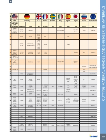 351CUTTING MATERIAL GRADES AND ENGINEERING MATERIALS Material Group No.USA Germany U.K. France Sweden Italy Spain Japan Russia EURONORMAISI/SAE/UNS/ASTM/AA Werkstoff DIN BS AFNOR SS UNI UNE JIS GOST EN37Titanium Grade 9;R56320;Ti-3Al-2.5V3.7195;3.7194 Ti6Al2.5V TiAl3V2.5-Type 9 Class 6 1;Gr 6 1 PT-3V Ti6Al2.5V37 3.7124 TiCu2TA 21;TA22;TA23;TA24T-U2 Ti-P1137 3.7185;3.7184Ti4Al4Mo2Sn;TiAl4Mo4Sn4Si0.5TA45;TA46;TA47;TA48;TA49;TA50;TA57T-A4DE Ti-P6837Titanium Grade 6;R54520;Ti-5Al-2.5Sn3.7115.1;3.7115TiAl5Sn2.5;TiAl 5 Sn 22TA14;TA17T-A5E;Ti-P.65 SAT-525 VT5-1 TiAl5Sn2.537 R56410;Ti-10V-2Fe-3Al37Titanium grade 23;R56401;Ti-6Al-4V-ELITi6Al4V ELI TA11 TiAl6V4ELI-Type 5.1Class 6 1;Gr 6 137 VST 5553 Ti5Al5V5Mo3Cr;Ti-5Al-5V-5Mo-3Cr37 Ti-4Al-3Mo-1V T-A4D3V VT1437 VT2238 1.2762 75CrMoNiW6-7;75 CrMoNiW 6 7 75CrMoNiW6-738 W1;T72301 1.1625 C80W2;C 80 W2 BW 18F.520.U;F.5107;C 80SK 75;SK 85;SK 85 M;SK 5;SK 5 M;SK 6U8-1 C80W238 W110;T72301 1.1545C105U;C 105 W 1;C 105 UC 105 E 2 U;Y1 105;C105E2U1880 C 100 KU F.515;F.516SK 105;SK 3;TC 105U10A-1;U10A-2;U11-1C105U38 1.6746 32NiCrMo14-5;32 NiCrMo 14-5 832 M 31 35 NCD 14 F.1262-32 NiCrMo 12 32NiCrMo14-538 W210;T72302 1.2833 100V1;100 V 1 BW 2C 105 E 2 UV 1;Y1 105 V;100 V 2102 V 2 KU SKS 43 100V1386145;6150;6150 H;G61500;H615001.815951CrV4;50CrV4;50 CrV 4735 A 50;735 A 51;735 H 51;735 M 50;En 4750CrV4RR;50 CV 4;51 CV 42230 50 CrV 4F.143;F.143.A;51 CrV 4;F.1430SUP 10;SUP 10-CSP;SUP 10 M50ChFA;50ChGFA 51CrV438 P20;T51620 1.2330 35CrMo4;35 CrMo 4 708 A 37 34 CD 4 2234 35 CrMo 4 35CrMo43838383838 1.8721 26MnCr6-3 26MnCr6-338383838 1.2083;1.2083 ESRX40Cr14;X 42 Cr 13X40Cr14;Z 40 C 14 2314 X 41 Cr 13 KU F.5263;X 40 Cr 13 SUS 420 J 2 X40Cr1438300M;4340M;K442201.6928 41SiNiCrMoV7-6 S 155