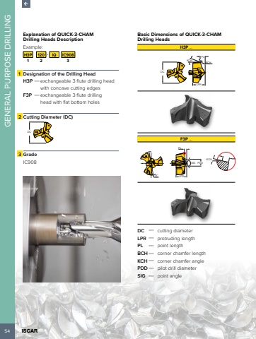 54 ISCAR GENERAL PURPOSE DRILLINGExplanation of QUICK-3-CHAM Drilling Heads Description Example:H3P 120 - IQ IC9081 2 31 Designation of the Drilling Head H3P %u2014 exchangeable 3 flute drilling head with concave cutting edgesF3P %u2014 exchangeable 3 flute drilling head with flat bottom holes2 Cutting Diameter (DC)DCKCH3 GradeIC908 Basic Dimensions of QUICK-3-CHAM Drilling HeadsH3P %u2026PLLPRDCKCHBCHF3P %u2026DCKCHSIG PDDPLLPRBCHDC %u2014 cutting diameterLPR %u2014 protruding lengthPL %u2014 point lengthBCH %u2014 corner chamfer lengthKCH %u2014 corner chamfer anglePDD %u2014 pilot drill diameterSIG %u2014 point angle