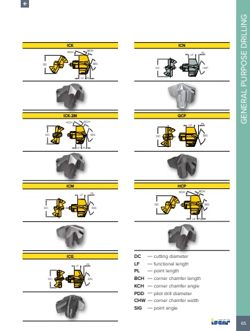 65GENERAL PURPOSE DRILLINGICKDCBCHSIGLF PLKCHICK-2MLF PLSIGKCH BCHDCICMLF PLDC SIGICGLF PLDC SIGICNPL LFDC 140%u00baQCPLF PLDC SIGHCPDCBCHSIGLF PLKCHDC %u2014 cutting diameterLF %u2014 functional lengthPL %u2014 point lengthBCH %u2014 corner chamfer lengthKCH %u2014 corner chamfer anglePDD %u2014 pilot drill diameterCHW %u2014 corner chamfer widthSIG %u2014 point angle