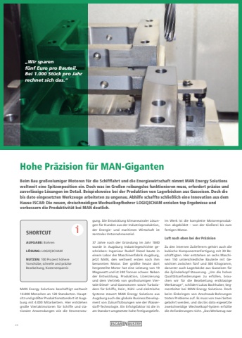 Hohe Pr%u00e4zision f%u00fcr MAN-GigantenMAN Energy Solutions besch%u00e4ftigt weltweit 14.000 Menschen an 120 Standorten. Hauptsitz und gr%u00f6%u00dfter Produktionsstandort ist Augsburg mit 4.000 Mitarbeitern. Hier entstehen gro%u00dfe Viertaktmotoren f%u00fcr Schiffe und station%u00e4re Anwendungen wie die Stromerzeugung. Die Entwicklung klimaneutraler L%u00f6sungen f%u00fcr Kunden aus der Industrieproduktion, der Energie- und maritimen Wirtschaft ist zentrales Unternehmensziel.37 Jahre nach der Gr%u00fcndung im Jahr 1840 wurde in Augsburg Industriegeschichte geschrieben: Ingenieur Rudolf Diesel baute in einem Labor der Maschinenfabrik Augsburg, jetzt MAN, den weltweit ersten nach ihm benannten Motor. Der gr%u00f6%u00dfte heute dort hergestellte Motor hat eine Leistung von 19 Megawatt und ist 240 Tonnen schwer. Neben der Entwicklung, Produktion, Lizenzierung und dem Vertrieb von gro%u00dfvolumigen Viertakt-Diesel- und Gasmotoren sowie Turboladern f%u00fcr Schiffe, Heiz-, K%u00fchl- und elektrische Systeme steuert MAN Energy Solutions aus Augsburg auch das globale Business Development von Zukunftsl%u00f6sungen wie der Wasserstoff-Technologie. Ein Erfolgsfaktor ist die in am Standort umgesetzte hohe Fertigungstiefe.Im Werk ist die komplette Motorenproduktion abgebildet %u2013 von der Gie%u00dferei bis zum fertigen Motor.Luft nach oben bei der Pr%u00e4zisionZu den internen Zulieferern geh%u00f6rt auch die kubische Komponentenfertigung mit 30 Besch%u00e4ftigten. Hier entstehen an sechs Maschinen 150 unterschiedliche Bauteile mit Gewichten zwischen f%u00fcnf und 300 Kilogramm, darunter auch Lagerb%u00f6cke aus Gusseisen f%u00fcr die Zylinderkopf-Steuerung. %u201eUm die hohen Qualit%u00e4tsanforderungen zu erf%u00fcllen, brauchen wir f%u00fcr die Bearbeitung erstklassige Werkzeuge%u201c, schildert Lukas Bachhuber, Segmentleiter bei MAN Energy Solutions. Doch beim Einbringen von Anschraub-Bohrungen traten Probleme auf. Es muss von zwei Seiten gebohrt werden, und das bis dato eigesetzte zweischneidige Wechselkopf-System erf%u00fcllte die Anforderungen nicht. %u201eDas Werkzeug war Beim Bau gro%u00dfvolumiger Motoren f%u00fcr die Schifffahrt und die Energiewirtschaft nimmt MAN Energy Solutions weltweit eine Spitzenposition ein. Doch was im Gro%u00dfen reibungslos funktionieren muss, erfordert pr%u00e4zise und zuverl%u00e4ssige L%u00f6sungen im Detail. Beispielsweise bei der Produktion von Lagerb%u00f6cken aus Gusseisen. Doch die bis dato eingesetzten Werkzeuge arbeiteten zu ungenau. Abhilfe schaffte schlie%u00dflich eine Innovation aus dem Hause ISCAR: Die neuen, dreischneidigen Wechselkopfbohrer LOGIQ3CHAM erzielen top Ergebnisse und verbessern die Produktivit%u00e4t bei MAN deutlich.%u201eWir sparen f%u00fcnf Euro pro Bauteil. Bei 1.000 St%u00fcck pro Jahr rechnet sich das.%u201cSHORTCUTAUFGABE: BohrenL%u00d6SUNG: LOGIQ3CHAMNUTZEN: 100 Prozent h%u00f6here Vorsch%u00fcbe, schnelle und pr%u00e4zise Bearbeitung, Kostenersparnisi24
