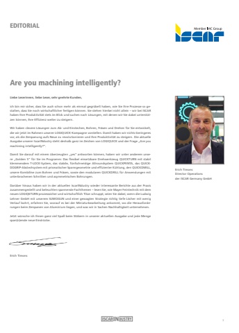 EDITORIALAre you machining intelligently?Liebe Leserinnen, liebe Leser, sehr geehrte Kunden,ich bin mir sicher, dass Sie auch schon mehr als einmal gegr%u00fcbelt haben, wie Sie Ihre Prozesse so gestalten, dass Sie noch wirtschaftlicher fertigen k%u00f6nnen. Sie stehen hierbei nicht allein %u2013 wir bei ISCAR haben Ihre Produktivit%u00e4t stets im Blick und suchen nach L%u00f6sungen, mit denen wir Sie dabei unterst%u00fctzen k%u00f6nnen, Ihre Effizienz weiter zu steigern. Wir haben clevere L%u00f6sungen zum Ab- und Einstechen, Bohren, Fr%u00e4sen und Drehen f%u00fcr Sie entwickelt, die wir jetzt im Rahmen unserer LOGIQUICK-Kampagne vorstellen. Damit haben wir nichts Geringeres vor, als die Zerspanung aufs Neue zu revolutionieren und Ihre Produktivit%u00e4t zu steigern. Die aktuelle Ausgabe unserer IscarINdustry steht deshalb ganz im Zeichen von LOGIQUICK und der Frage %u201eAre you machining intelligently?%u201c.Damit Sie darauf mit einem %u00fcberzeugten %u201eyes%u201c antworten k%u00f6nnen, haben wir unter anderem unsere %u201eGolden 5%u201c f%u00fcr Sie im Programm: Das flexibel einsetzbare Drehwerkzeug QUICKTURN mit stabil klemmendem T-LOCK-System, das stabile, f%u00fcnfschneidige Allroundsystem QUICKPENTA, das QUICKDOGRIP-Abstechsystem mit prismatischer Spanngeometrie und effizienter K%u00fchlung, den QUICKDMILL, unsere Kombiline zum Bohren und Fr%u00e4sen, sowie den modularen QUICKDRILL f%u00fcr Anwendungen mit unterbrochenen Schnitten und asymmetrischen Bohrungen.Dar%u00fcber hinaus haben wir in der aktuellen IscarINdustry wieder interessante Berichte aus der Praxis zusammengestellt und beleuchten spannende Fachthemen %u2013 lesen Sie, wie Mayer Feintechnik mit dem neuen LOGIQ6TURN prozesssicher und wirtschaftlich Titan schruppt, seien Sie dabei, wenn die Ludwig Lehner GmbH mit unserem SUMOGUN und einer gewagten Strategie richtig tiefe L%u00f6cher mit wenig Verlauf bohrt, erfahren Sie, worauf es bei der Miniaturbearbeitung ankommt, wo die Herausforderungen beim Zerspanen von Aluminium liegen, und was wir in Sachen Nachhaltigkeit unternehmen.Jetzt w%u00fcnsche ich Ihnen ganz viel Spa%u00df beim St%u00f6bern in unserer aktuellen Ausgabe und jede Menge span(n)ende neue Eindr%u00fccke.Erich TimonsErich TimonsDirector Operations der ISCAR Germany GmbH3