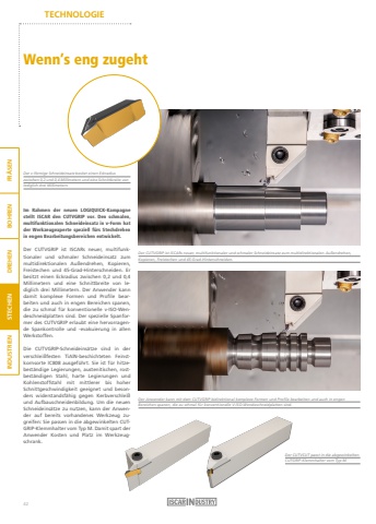 TECHNOLOGIEFR%u00c4SEN BOHREN DREHEN STECHEN INDUSTRIENWenn%u2019s eng zugehtIm Rahmen der neuen LOGIQUICK-Kampagne stellt ISCAR den CUTVGRIP vor. Den schmalen, multifunktionalen Schneideinsatz in v-Form hat der Werkzeugexperte speziell f%u00fcrs Stechdrehen in engen Bearbeitungsbereichen entwickelt. Der CUTVGRIP ist ISCARs neuer, multifunktionaler und schmaler Schneideinsatz zum multidirektionalen Au%u00dfendrehen, Kopieren, Freistechen und 45-Grad-Hinterschneiden. Er besitzt einen Eckradius zwischen 0,2 und 0,4 Millimetern und eine Schnittbreite von lediglich drei Millimetern. Der Anwender kann damit komplexe Formen und Profile bearbeiten und auch in engen Bereichen spanen, die zu schmal f%u00fcr konventionelle v-ISO-Wendeschneidplatten sind. Der spezielle Spanformer des CUTVGRIP erlaubt eine hervorragende Spankontrolle und -evakuierung in allen Werkstoffen.Die CUTVGRIP-Schneideins%u00e4tze sind in der verschlei%u00dffesten TiAlN-beschichteten Feinstkornsorte IC808 ausgef%u00fchrt. Sie ist f%u00fcr hitzebest%u00e4ndige Legierungen, austenitischen, rostbest%u00e4ndigen Stahl, harte Legierungen und Kohlenstoffstahl mit mittlerer bis hoher Schnittgeschwindigkeit geeignet und besonders widerstandsf%u00e4hig gegen Kerbverschlei%u00df und Aufbauschneidenbildung. Um die neuen Schneideins%u00e4tze zu nutzen, kann der Anwender auf bereits vorhandenes Werkzeug zugreifen: Sie passen in die abgewinkelten CUTGRIP-Klemmhalter vom Typ M. Damit spart der Anwender Kosten und Platz im Werkzeugschrank.Der v-f%u00f6rmige Schneideinsatz besitzt einen Eckradius zwischen 0,2 und 0,4 Millimetern und eine Schnittbreite von lediglich drei Millimetern.Der CUTVGRIP ist ISCARs neuer, multifunktionaler und schmaler Schneideinsatz zum multidirektionalen Au%u00dfendrehen, Kopieren, Freistechen und 45-Grad-Hinterschneiden. Der Anwender kann mit dem CUTVGRIP bidirektional komplexe Formen und Profile bearbeiten und auch in engen Bereichen spanen, die zu schmal f%u00fcr konventionelle V-ISO-Wendeschneidplatten sind. Der CUTVCUT passt in die abgewinkelten CUTGRIP-Klemmhalter vom Typ M.42