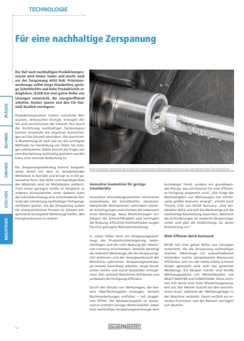 FR%u00c4SEN BOHREN DREHEN STECHEN INDUSTRIENTECHNOLOGIEF%u00fcr eine nachhaltige ZerspanungDer Ruf nach nachhaltigen Produktionsprozessen wird immer lauter und macht auch vor der Zerspanung nicht Halt. Pr%u00e4zisionswerkzeuge sollen lange Standzeiten, geringe Schnittkr%u00e4fte und hohe Produktivit%u00e4t erm%u00f6glichen. ISCAR hat eine ganze Reihe von L%u00f6sungen entwickelt, die energieeffizient arbeiten, Kosten sparen und den CO2-Aussto%u00df deutlich verringern.Produktionsprozesse nutzen nat%u00fcrliche Ressourcen, verbrauchen Energie, erzeugen Abfall und verschmutzen die Umwelt. Nur durch die Einf%u00fchrung nachhaltiger Technologien k%u00f6nnen Anwender die negativen Auswirkungen auf die Umwelt abmildern. Die maschinelle Bearbeitung ist nach wie vor die wichtigste Methode zur Herstellung von Teilen f%u00fcr Anlagen und Systeme. Daher kommt der Frage, wie eine Bearbeitung nachhaltig gestaltet werden kann, eine zentrale Bedeutung zu.Ein Zerspanungswerkzeug kommt beispielsweise direkt mit dem zu bearbeitenden Werkst%u00fcck in Kontakt und bringt es in die gew%u00fcnschte Form. Der daf%u00fcr nicht ben%u00f6tigte Rest des Materials wird als Metallsp%u00e4ne entfernt.Trotz seiner geringen Gr%u00f6%u00dfe im Vergleich zu anderen Komponenten eines Systems kann das Schneidwerkzeug eine entscheidende Rolle bei der Umsetzung nachhaltiger Fertigungsverfahren spielen. Da die Zerspanung zudem ein energieintensiver Prozess ist, k%u00f6nnen entsprechend konzipierte Werkzeuge helfen, den Energieverbrauch zu senken.Innovative Geometrien f%u00fcr geringe Schnittkr%u00e4fteInnovative Schneidengeometrien minimieren beispielsweis die Schnittkr%u00e4fte, vibrationsd%u00e4mpfende Mechanismen verhindern st%u00f6rende Schwingungen und erh%u00f6hen die Lebenszeit eines Werkzeugs. Neue Beschichtungen verbessern die Schmierf%u00e4higkeit und verringern die Reibung. Effiziente K%u00fchlmethoden sorgen f%u00fcr eine geringere W%u00e4rmeentwicklung.In vielen F%u00e4llen kann ein Zerspanungswerkzeug die Produktivit%u00e4tssteigerung beeintr%u00e4chtigen und die volle Nutzung der Maschinen-Leistung einschr%u00e4nken. Deshalb ben%u00f6tigt die Industrie Werkzeuge, die die Zerspanungszeit verk%u00fcrzen und den Energieverbrauch der Maschinen optimieren. Zerspanungswerkzeuge m%u00fcssen zuverl%u00e4ssig arbeiten, lange Standzeiten bieten und kurze R%u00fcstzeiten erm%u00f6glichen. Das verk%u00fcrzt Maschinen-Stillst%u00e4nde und verbessert die Fertigungs-Effizienz.Durch den Einsatz von Werkzeugen, die bessere Oberfl%u00e4cheng%u00fcten erzeugen, k%u00f6nnen Nachbearbeitungen entfallen %u2013 mit doppeltem Effekt: Die Bearbeitungszeit ist k%u00fcrzer, und es entsteht weniger Materialabfall. Dabei sind nachhaltige Zerspanungswerkzeuge kein kurzlebiger Trend, sondern ein grundlegendes Prinzip, das schrittweise f%u00fcr eine effiziente Fertigung umgesetzt wird. %u201eDie Frage der Nachhaltigkeit von Werkzeugen hat mittlerweile gr%u00f6%u00dfte Relevanz erlangt%u201c, erkl%u00e4rt Erich Timons, CTO von ISCAR Germany. %u201eDas Verst%u00e4ndnis daf%u00fcr, wie sich die Werkzeuge auf die nachhaltige Bearbeitung auswirken, bestimmt die Anforderungen an moderne Zerspanungsmittel und gibt die Sto%u00dfrichtung f%u00fcr deren Entwicklung vor.%u201cMehr Effizienz durch AustauschISCAR hat eine ganze Reihe von L%u00f6sungen entwickelt, die die Zerspanung nachhaltiger machen. Werkzeuge mit auswechselbaren Schneiden nutzen beispielsweise Ressourcen effizienter, weil nur der relativ kleine Schneidk%u00f6rper getauscht wird statt des gesamten Werkzeugs. Ein Beispiel hierf%u00fcr sind ISCARs Werkzeugsysteme mit Wechselk%u00f6pfen wie MULTI-MASTER und SUMOCHAM. Diese zeichnen sich durch eine hohe Wiederholgenauigkeit aus: Der Werker tauscht nur den verschlissenen Kopf, w%u00e4hrend der Werkzeugtr%u00e4ger in der Maschine verbleibt. Damit entf%u00e4llt ein erneutes Einmessen und die R%u00fcstzeit verringert sich deutlich.Beim Ausdrehen verbessert der Einsatz von Antivibrations-Bohrstangen die Leistung und reduziert den Stromverbrauch.54