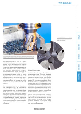 FR%u00c4SEN BOHREN DREHEN STECHEN INDUSTRIENTECHNOLOGIEEine Weiterentwicklung sind die LOGIQ3-CHAM-Bohrwerkzeuge mit austauschbaren K%u00f6pfen. Die ISCAR-L%u00f6sung verf%u00fcgt %u00fcber drei Schneiden. Damit erreicht der Anwender im Vergleich zu zweischneidigen Werkzeugen um bis zu 50 Prozent h%u00f6here Geschwindigkeiten und Vorschube %u2013 dadurch sinkt der Energieverbrauch. Deutlich wird dies an Bohrungen mit einem Durchmesser von 16 und einer Tiefe von 80 Millimetern an einem Bauteil aus niedrig legiertem Stahl. Bei einer Standzeit von 500 Bohrungen verk%u00fcrzt der Einsatz von LOGIQ3-CHAM im Vergleich zu einer zweischneidigen Wettbewerbsl%u00f6sung die Zykluszeit um 26 Prozent und der Energieverbrauch sinkt um 19 Prozent.Eine wesentliche Rolle bei der Reduzierung des Energieverbrauchs, der Verl%u00e4ngerung der Lebensdauer und der Verbesserung der Oberfl%u00e4cheng%u00fcte spielt die vibrationsd%u00e4mpfende Auslegung von Zerspanungswerkzeugen. Daf%u00fcr hat ISCAR verschiedene L%u00f6sungen entwickelt, beispielsweise die Schwingungsd%u00e4mpfung in Bohrstangen und vibrationsfreie Schneidengeometrien, variable Spiralwinkel, ungleiche Zahnteilungen in mehrschneidigen Vollhartmetallfr%u00e4sern und -k%u00f6pfen sowie eine segmentierte Schneidkante f%u00fcr eine effektive Spanabfuhr.RohstoffeinsparungenMit ISCARs Reduzieradapter f%u00fcr ISO-Wendeschneidplatten (WSP) kann der Anwender kleinere WSP montieren. Werkzeugk%u00f6rper sind dadurch l%u00e4nger im Einsatz, Rohstoffe werden eingespart. Neue Nachhaltigkeits-Aspekte ergeben sich durch den zunehmenden Einsatz der Additiven Fertigung (AM). Mit dieser Technologie lassen sich Werkzeugk%u00f6rper herstellen, die der endg%u00fcltigen Form bereits sehr nahekommen. Das minimiert Feinarbeiten und senkt den Materialverbrauch. Dar%u00fcber hinaus erleichtert AM die optimale Gestaltung der inneren K%u00fchlkan%u00e4le, was den K%u00fchlmittelfluss durch den Werkzeugk%u00f6rper verbessert.Energie- und materialeffiziente, langlebige Zerspanungswerkzeuge haben einen erheblichen Einfluss auf die technologische Nachhaltigkeit. %u201eSolche Werkzeuge helfen, Energieverbrauch und Abfall zu reduzieren, sparen Kosten und tragen zum Umweltschutz bei%u201c, fasst Erich Timons zusammen.Die Geometrie des Spanteilers der MILLSHRED-Wendeschneidplatten-Fr%u00e4ser von ISCAR sorgt f%u00fcr eine hohe Bearbeitungs-Stabilit%u00e4t und eine bessere Spanabfuhr.Der LOGIQ-3-CHAM-Bohrer von ISCAR mit austauschbarem Hartmetallkopf besitzt drei Schneiden.55