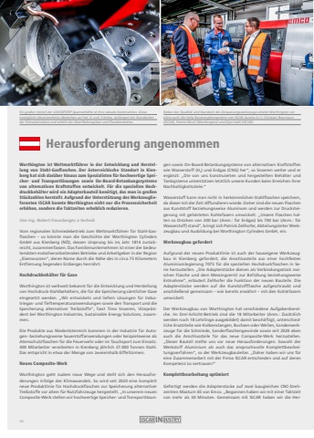 Herausforderung angenommenWorthington ist Weltmarktf%u00fchrer in der Entwicklung und Herstellung von Stahl-Gasflaschen. Der %u00f6sterreichische Standort in Kienberg hat sich dar%u00fcber hinaus zum Spezialisten f%u00fcr hochwertige Speicher- und Transportl%u00f6sungen sowie On-Board-Betankungssysteme von alternativen Kraftstoffen entwickelt. F%u00fcr die speziellen Hochdruckbeh%u00e4lter wird ein Adapterbauteil ben%u00f6tigt, das man in gro%u00dfen St%u00fcckzahlen herstellt. Aufgrund der Unterst%u00fctzung des Werkzeuglieferanten ISCAR konnte Worthington nicht nur die Prozesssicherheit erh%u00f6hen, sondern die Taktzeiten erheblich reduzieren.Von Ing. Robert Fraunberger, x-technikVom regionalen Schmiedebetrieb zum Weltmarktf%u00fchrer f%u00fcr Stahl-Gasflaschen %u2013 so k%u00f6nnte man die Geschichte der Worthington Cylinders GmbH aus Kienberg (N%u00d6), dessen Ursprung bis ins Jahr 1814 zur%u00fcckreicht, zusammenfassen. Das Familienunternehmen ist einer der bedeutendsten metallverarbeitenden Betriebe und Arbeitgeber in der Region %u201eEisenwurzen%u201c, deren Name durch die N%u00e4he des in circa 75 Kilometern Entfernung liegenden Erzberges herr%u00fchrt.Hochdruckbeh%u00e4lter f%u00fcr GaseWorthington ist weltweit bekannt f%u00fcr die Entwicklung und Herstellung von Hochdruck-Stahlbeh%u00e4ltern, die f%u00fcr die Speicherung s%u00e4mtlicher Gase eingesetzt werden. %u201eWir entwickeln und liefern L%u00f6sungen f%u00fcr Industriegas- und Tieftemperaturanwendungen sowie den Transport und die Speicherung alternativer Treibstoffe%u201c, fasst Timo Snoeren, Vizepr%u00e4sident bei Worthington Industries, Sustainable Energy Solutions, zusammen.Die Produkte aus Nieder%u00f6sterreich kommen in der Industrie f%u00fcr Autogen- beziehungsweise Sauerstoffanwendungen oder beispielsweise als Atemschutzflaschen f%u00fcr die Feuerwehr oder im Tauchsport zum Einsatz. 400 Mitarbeiter verarbeiten in Kienberg j%u00e4hrlich 27.000 Tonnen Stahl.Das entspricht in etwa der Menge von zweieinhalb Eiffelt%u00fcrmen.Neues Composite-WerkWorthington geht zudem neue Wege und stellt sich den Herausforderungen infolge des Klimawandels. So wird seit 2020 eine komplett neue Produktlinie f%u00fcr Hochdruckflaschen zur Speicherung alternativer Treibstoffe vor allem f%u00fcr Nutzfahrzeuge hergestellt. %u201eIn unserem neuen Composite-Werk stellen wir hochwertige Speicher- und Transportl%u00f6sungen sowie On-Board-Betankungssysteme von alternativen Kraftstoffen wie Wasserstoff (H2) und Erdgas (CNG) her%u201c, so Snoeren weiter und er erg%u00e4nzt: %u201eDie von uns konstruierten und hergestellten Beh%u00e4lter und Tanksysteme unterst%u00fctzen letztlich unsere Kunden beim Erreichen ihrer Nachhaltigkeitsziele.%u201cWasserstoff kann man nicht in herk%u00f6mmlichen Stahlflaschen speichern, da dieser mit der Zeit diffundieren w%u00fcrde. Daher sind die neuen Flaschen aus Kunststoff beziehungsweise Aluminum und werden zur Drucksteigerung mit geh%u00e4rteten Kohlefasern umwickelt. %u201eUnsere Flaschen halten so Dr%u00fccken von 200 bar (Anm.: f%u00fcr Erdgas) bis 700 bar (Anm.: f%u00fcr Wasserstoff) stand%u201c, bringt sich Patrick Zellhofer, Abteilungsleiter Werkzeugbau und Ausbildung bei Worthington Cylinders GmbH, ein.Werkzeugbau gefordertAufgrund der neuen Produktlinie ist auch der hauseigene Werkzeugbau in Kienberg gefordert, die Anschlussteile aus einer hochfesten Aluminiumlegierung 7075 f%u00fcr die speziellen Hochdruckflaschen in Serie herzustellen. %u201eDie Adapterst%u00fccke dienen als Verbindungsst%u00fcck zwischen Flasche und dem Messingventil zur Bef%u00fcllung beziehungsweise Entnahme%u201c, erl%u00e4utert Zellhofer die Funktion der neuen Bauteile. Die Adapterst%u00fccke werden auf die Kunststoffflasche aufgeschraubt und anschlie%u00dfend gemeinsam %u2013 wie bereits erw%u00e4hnt %u2013 mit den Kohlefasern umwickelt.Der Werkzeugbau von Worthington hat verschiedene Aufgabenbereiche. Im Drei-Schicht-Betrieb sind die 18 Mitarbeiter (Anm.: Zus%u00e4tzlich werden noch 18 Lehrlinge ausgebildet) damit besch%u00e4ftigt, unterschiedliche Ersatzteile wie Kolbenstangen, Buchsen oder Wellen, Sonderwerkzeuge f%u00fcr die Schmiede, Sonderflaschengewinde sowie seit 2020 eben auch die Anschlussteile f%u00fcr das neue Composite-Werk herzustellen.%u201eDieser Bauteil stellte uns vor neue Herausforderungen. Sowohl der Werkstoff Aluminium als auch das anspruchsvolle Komplettbearbeitungsverfahren%u201c, so der Werkzeugbauleiter. %u201eDaher haben wir uns f%u00fcr eine Zusammenarbeit mit der Firma ISCAR entschieden und auf deren Kompetenz zu vertrauen!%u201cKomplettbearbeitung optimiertGefertigt werden die Adapterst%u00fccke auf zwei baugleichen CNC-Drehzentren Maxturn 65 von Emco. %u201eBegonnen haben wir mit einer Taktzeit von mehr als 30 Minuten. Gemeinsam mit ISCAR haben wir die HerNeben der Qualit%u00e4t und Standzeit der Zerspanungswerkzeuge sch%u00e4tzt Worthington vor allem auch die hohe Beratungskompetenz von ISCAR Austria (v.l.): Christian Braumann (ISCAR), Patrick Musil (Worthington) und Zijat Halili (ISCAR).Ein gro%u00dfer Vorteil der LOGIQFGRIP-Spannsch%u00e4fte ist ihre robuste Konstruktion. Diese erm%u00f6glicht vibrationsfreies Abstechen auf der X- und Y-Achse, verl%u00e4ngert die Standzeiten der Schneideins%u00e4tze und erh%u00f6ht die Oberfl%u00e4cheng%u00fcten und Planebenheiten.66