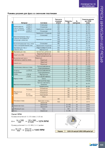 n =   Vc x 12      =   410 x 12   = 1045 RPM        Подача:    0.05-0.15 мм/зуб 0.002-0.006 дюйм/зуб