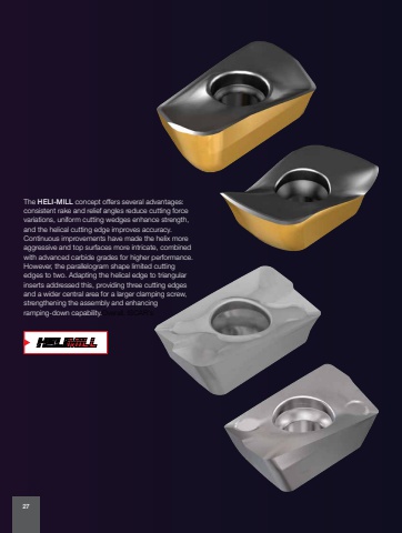 The HELI-MILL concept offers several advantages: consistent rake and relief angles reduce cutting force variations, uniform cutting wedges enhance strength, and the helical cutting edge improves accuracy. Continuous improvements have made the helix more aggressive and top surfaces more intricate, combined with advanced carbide grades for higher performance. However, the parallelogram shape limited cutting edges to two. Adapting the helical edge to triangular inserts addressed this, providing three cutting edges and a wider central area for a larger clamping screw, strengthening the assembly and enhancing ramping-down capability.Overall, ISCAR's 27